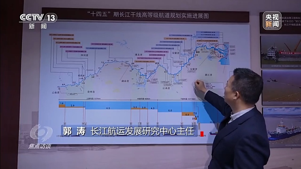 郭涛:十年前,因为局部的堵点卡点,航道标准不能统一,水深没法贯通起来。通过十年的整治和疏浚,水深显著提升了,可以通航的船舶更大了,物流成本就更低了。