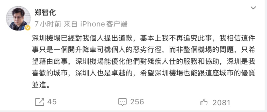 随后,郑智化回应称,深圳机场现已对他个人提出抱歉,他不再追查此事,信任这件事仅仅一个开升降车司机个人的恶劣行径,而非整个机场的问题,只期望借由此事,深圳机场能优化对残疾人士的服务和帮忙。
